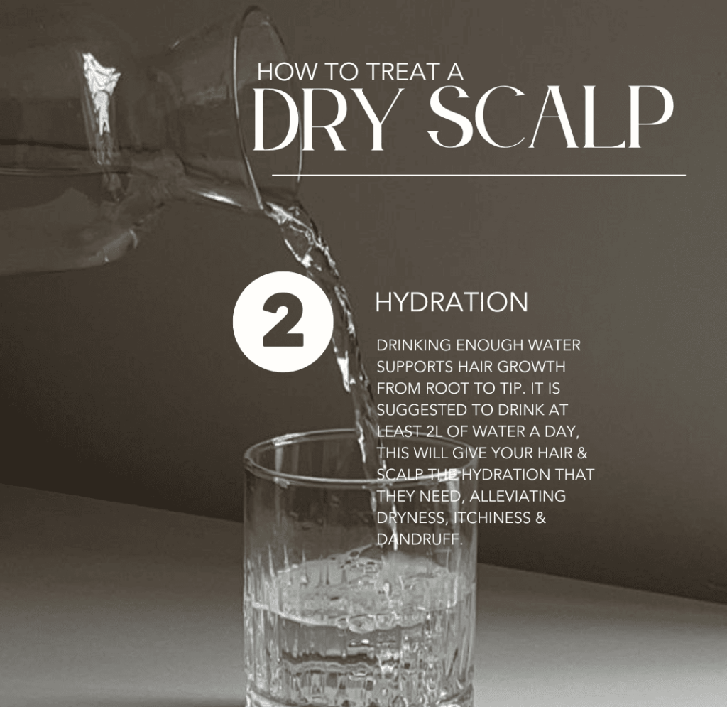 Hydrating your body from the inside out is crucial for healthy hair and scalp. Drinking enough water, at least 2 litres per day, alongside it’s various other benefits to the body, directly supports hair growth and helps alleviate dryness, itchiness, and dandruff.