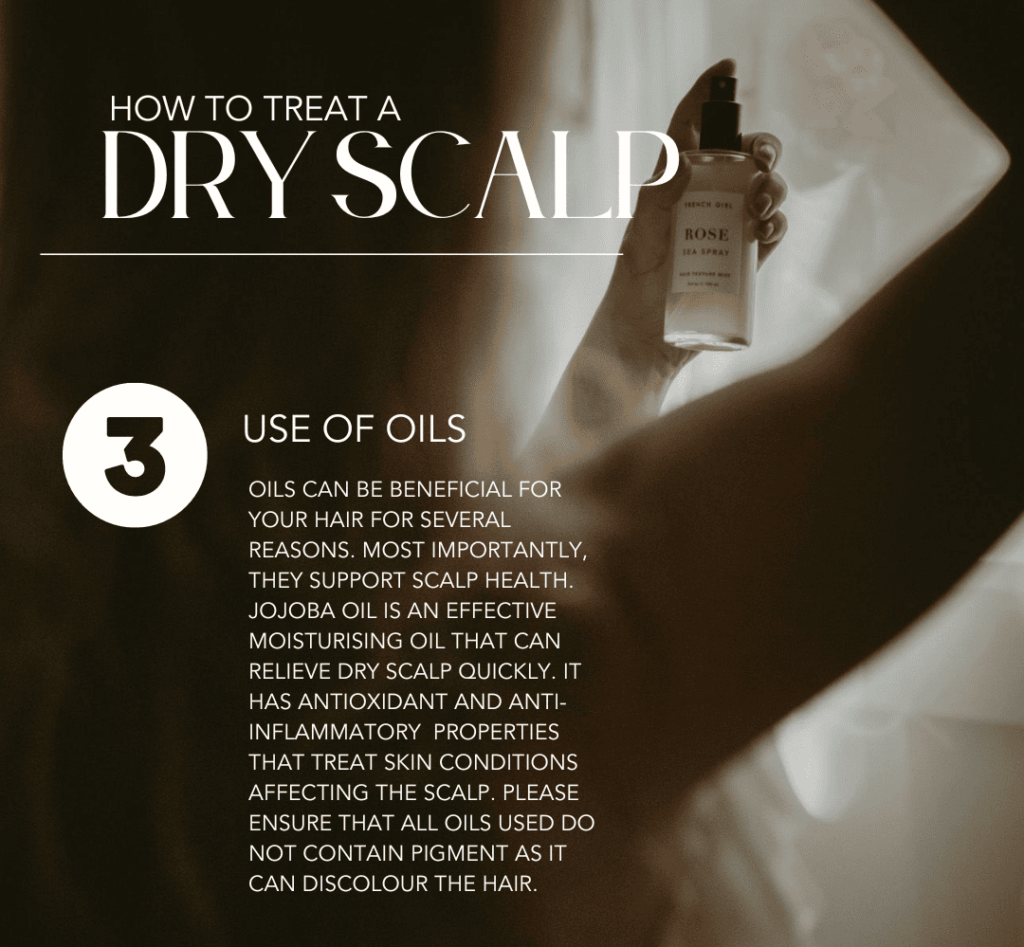 nourishment while combating dryness. Jojoba oil, in particular, is highly effective in moisturising the scalp and relieving dryness. It possesses antioxidant and anti-inflammatory properties, making it beneficial for treating various skin conditions affecting the scalp.